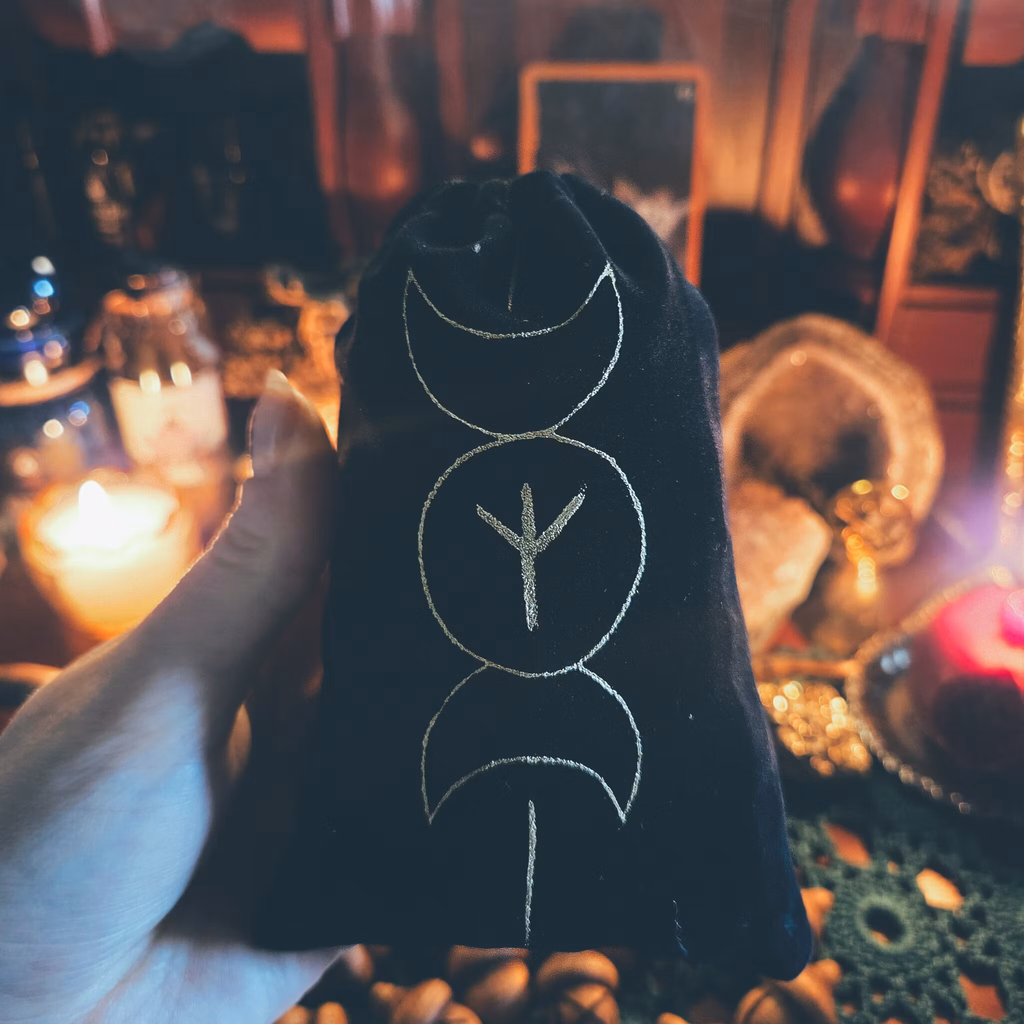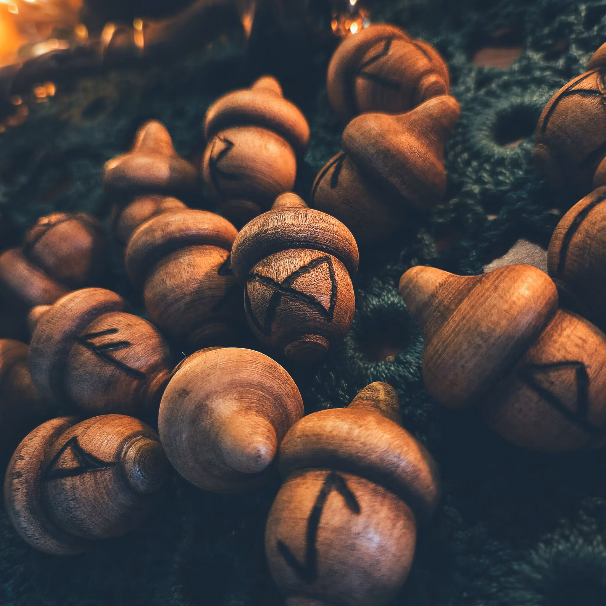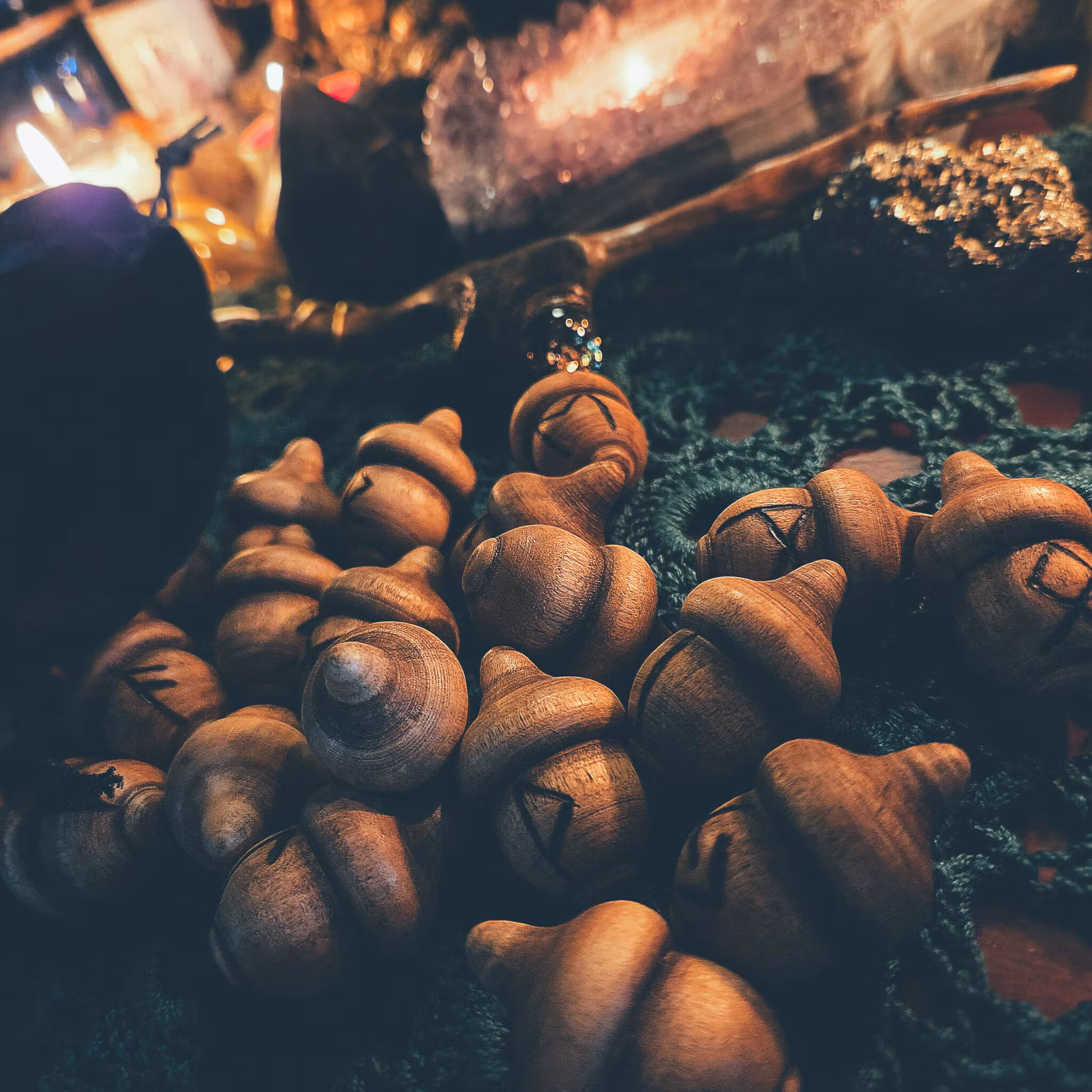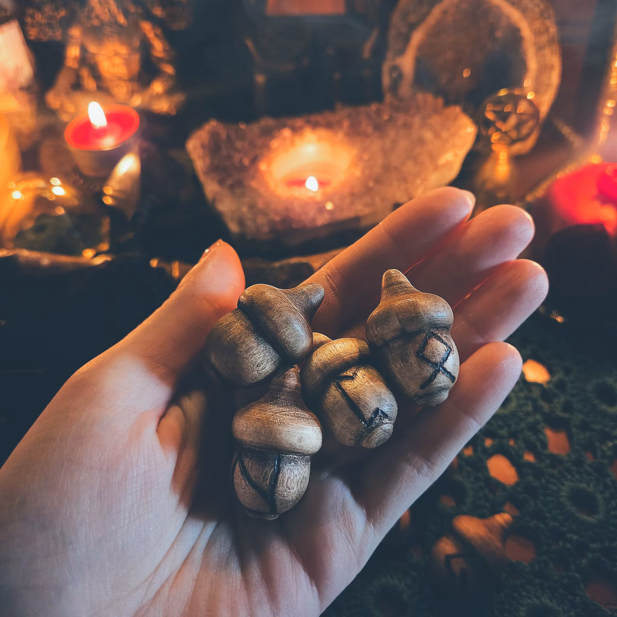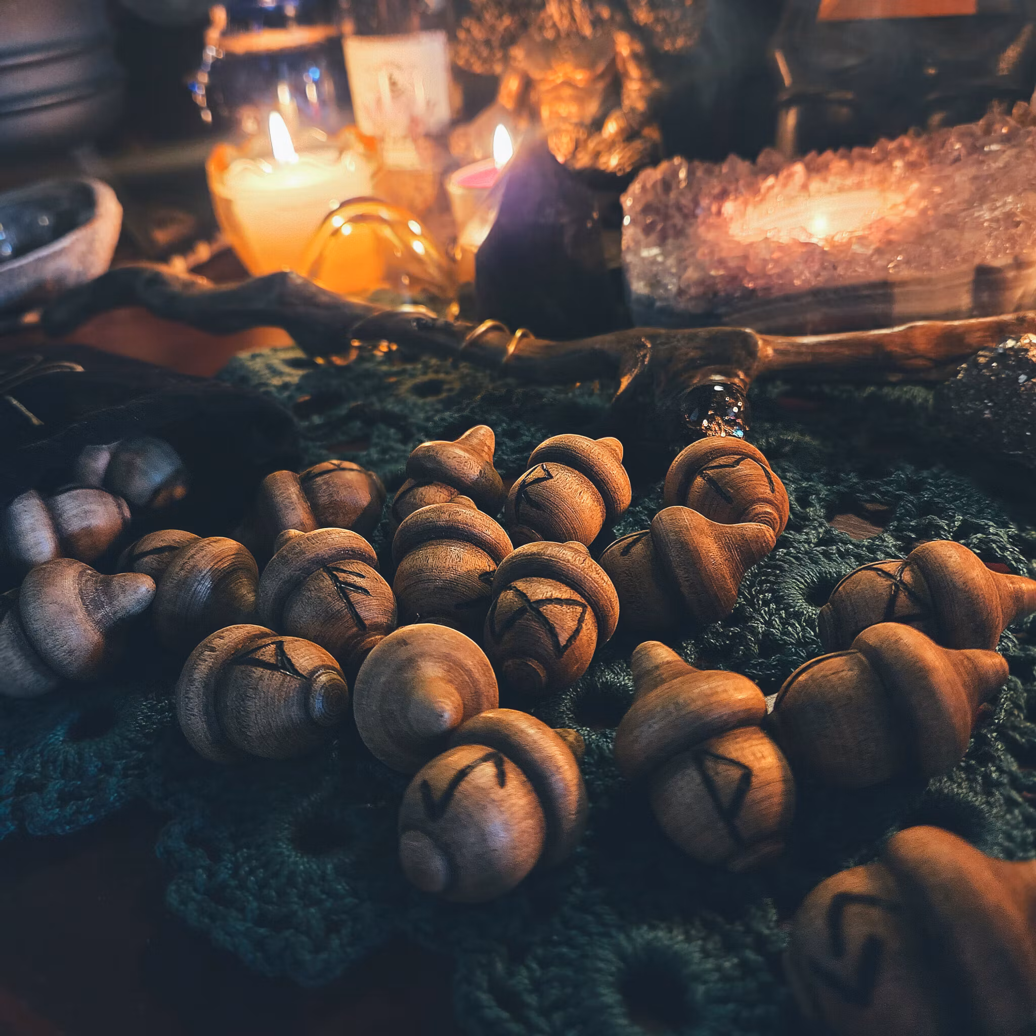 Detta runset är handgjort i trä format som små ekollon som har inristats och betsats för hand. Varje runa är skapad under en ritual där jag har mediterat över innebörden av varje runa samtidigt som den har bränts in i varje ekollon. Tillsammans bildar ekollonen och runsymbolen ett kraftfullt verktyg för spådom och vägledning. Setet innehåller 24 futhark runor, samt ett blankt ekollon för de som önskar att spå med en blank runa (Wyrd).
