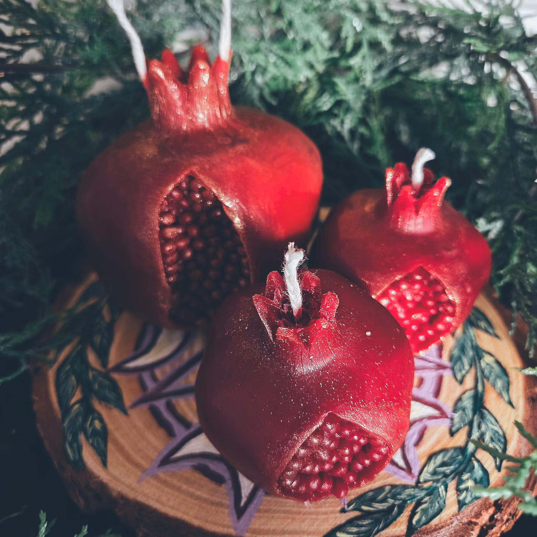 Granatäpplet har länge betraktats som en magisk frukt. Genom myten om Gudinnan Persephone, dotter till Zeus och Demeter, har granatäpplet kommit blivit känt som undervärldens frukt och de dödas mat. Persephone kidnappades av underjordens Gud, Hades, som hade blivit förälskad i henne. I underjorden lurades hon att äta från ett granatäpple utan att veta att om man äter av de dödas mat kan man aldrig lämna deras rike. I en kompromiss föreslog Persephones far, Zeus, att hon skulle stanna i underjorden lika många månader som antalet granatäpplekärnor hon hade ätit. Det slutade med att Persephone skulle tillbringa åtta av årets tolv månader på jorden och fyra i dödsriket. På så sätt förklarar myten om Persephone årshjulet och årstidernas cykliska processer. Det sades att Demeter, fruktbarhetsgudinnan, sörjde hennes dotters nedstigning till underjorden så pass mycket att allt på jorden vissnade och dog de månader Persephone var borta. Utöver det har granatäpplet länge betraktats som en lyckobringande frukt inom häxkonst. Granatäpplet anses egentligen vara en maskulin frukt som associeras med planeten Merkurius och eldelementet. Merkurius associeras med kommunikation och visdom, på så sätt är granatäpplet också, med sin association till de döda och Merkurius, en bra korrespondens när vi arbetar med den andra sidan eller förfäder. Ljuset är tillverkat med eteriska oljor som associeras med divination, den andra sidan, kommunikation och övergångar likt frankincense och ros bland annat. Även BelthaLunas egna granatäpplepulver har ingjutet i ljuset.