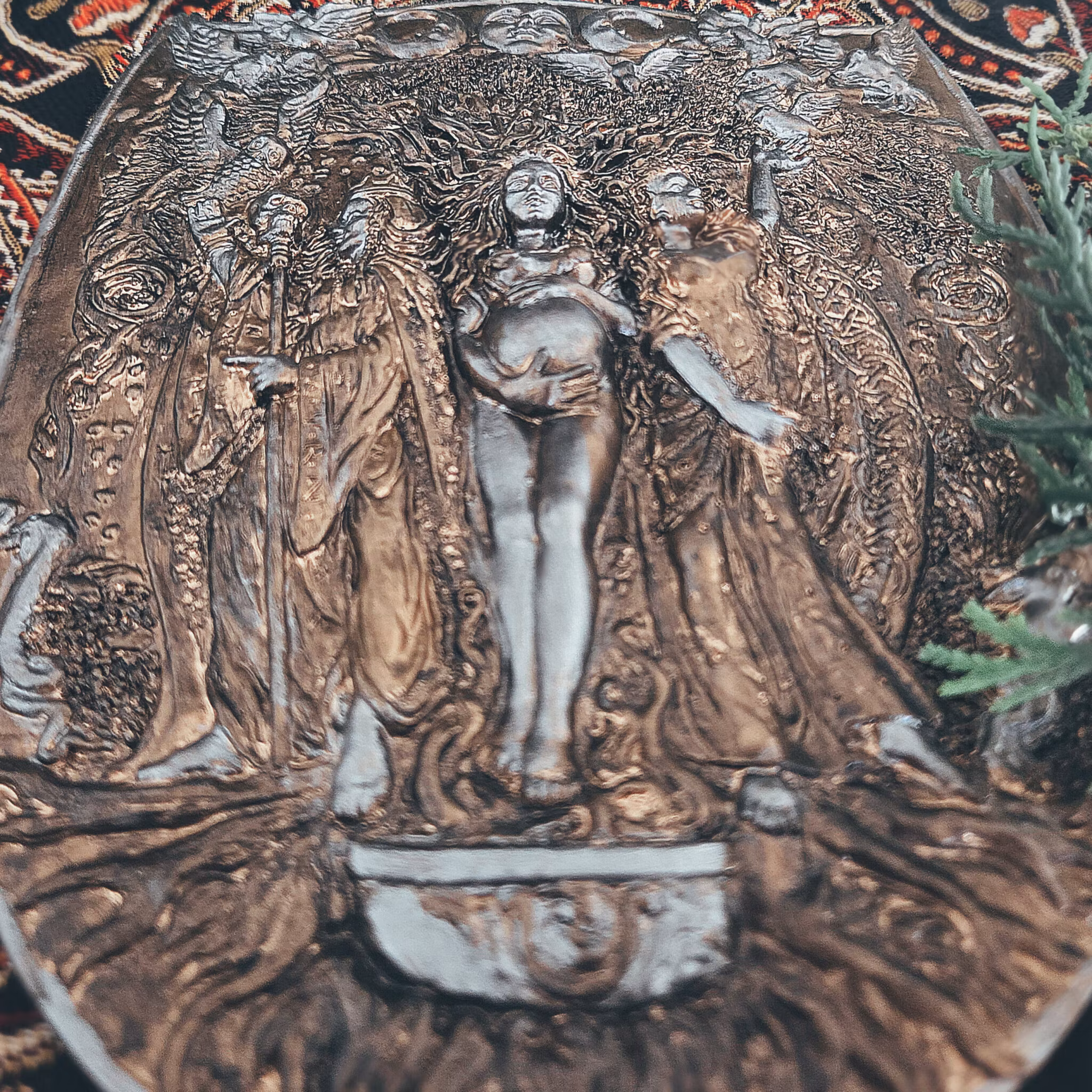 En vacker och detaljerad väggplanch i resin föreställande Triple Moon Gudinnan och hennes tre former som Jungfrun, Modern och Haggan. Väggplanchen är handmålad och oregelbundenheter kan förekomma. Den är ca. 21 x 16 cm.