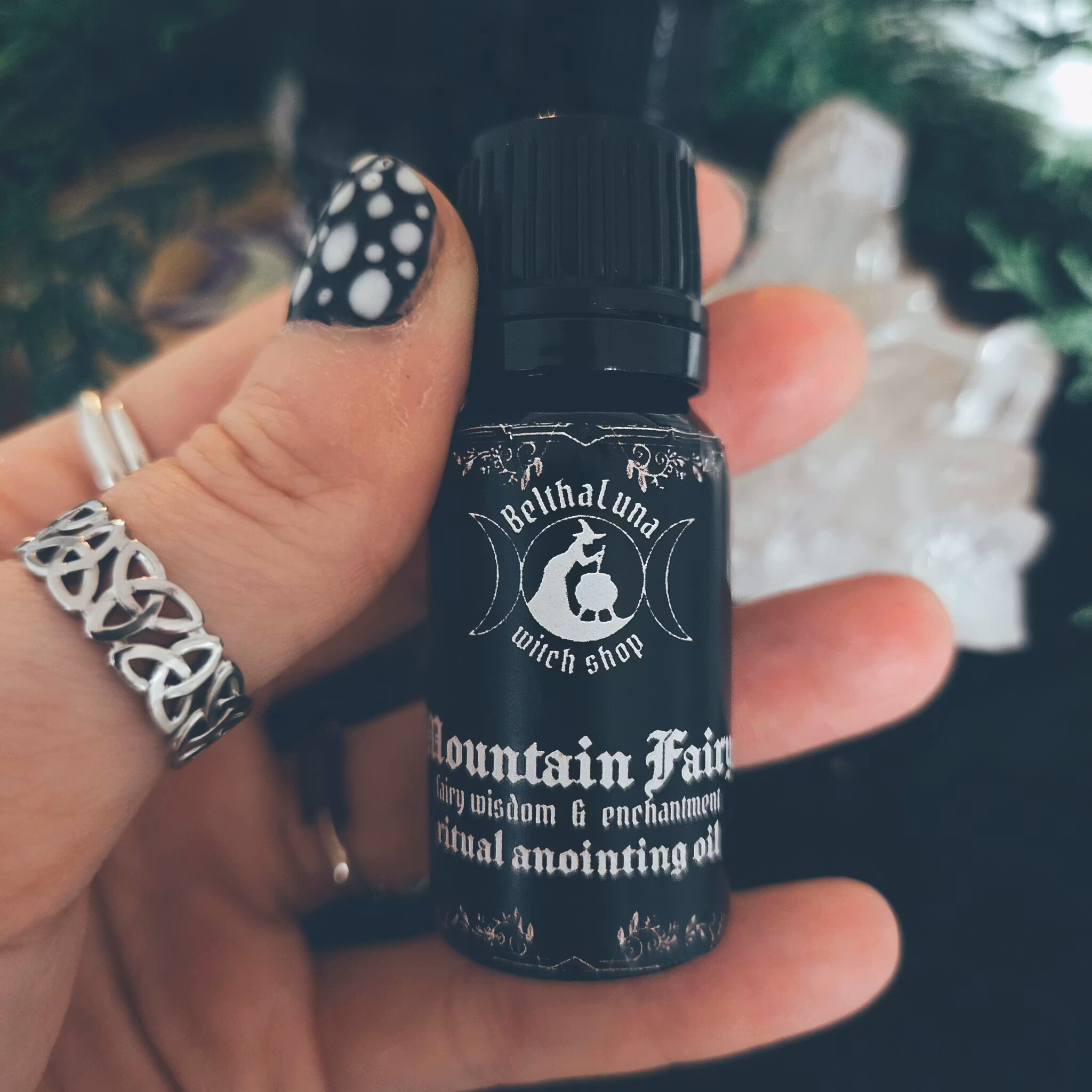 Den bosniska Bergsfen " Gorska Vila" är en av de äldsta älvorna i bosnisk mytologi. Bergsfen är älvorikets Hagga; klok, en helare och en beskyddare. Tron på älvor är inte bara en del av den bosniska mytologin, utan snarare en del av den magiska traditionen. Bosniska häxor, eller stravarke som de kallas, kallar på älvor, särskilt Bergsfen, för hjälp med helande ritualer och tilltalar henne som mamma eller syster. Denna rituella olja kallar på Bergsfen för vägledning, visdom och magi. Oljan är skapad under fullmånen med magiska växter, kristaller och eteriska oljor av germanium, immortelle och kamomill bland annat. Geranium är feminin växt som associeras beskydd och används för healing i många olika kulturer världen om. Just i balkan anses geranium vara en av de mest beskyddande och läkande växterna. Immortelle är i balkan känd som en älvväxt och används ofta när man arbetar med älvriket. Oljan är även laddad och innehåller månsten, samt även torkade örter likt citronmeliss, syren och liljor. Doften är mycket blommig, söt och magisk!